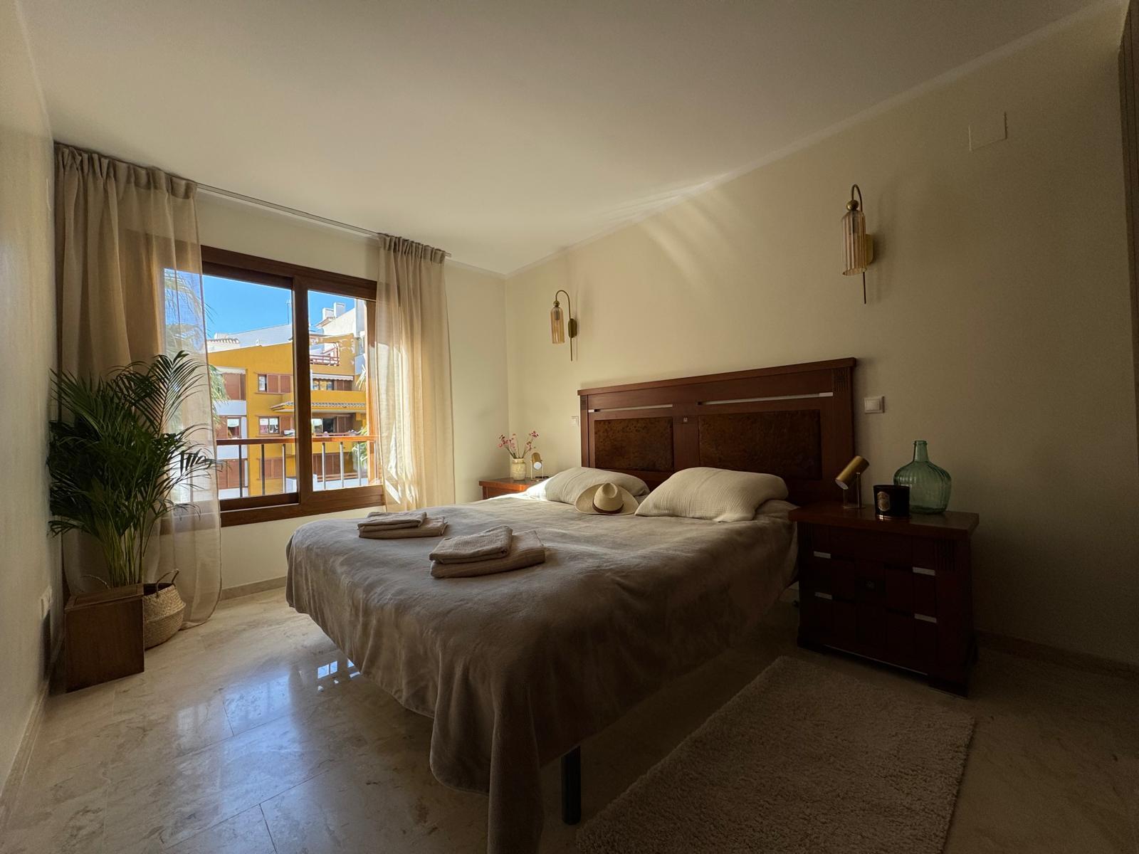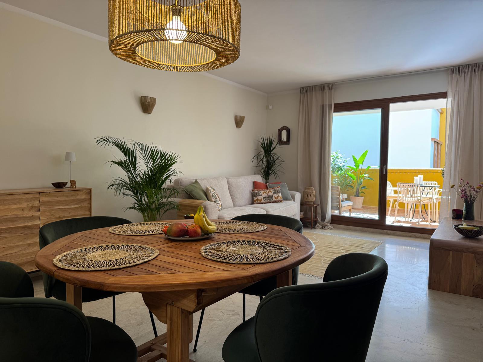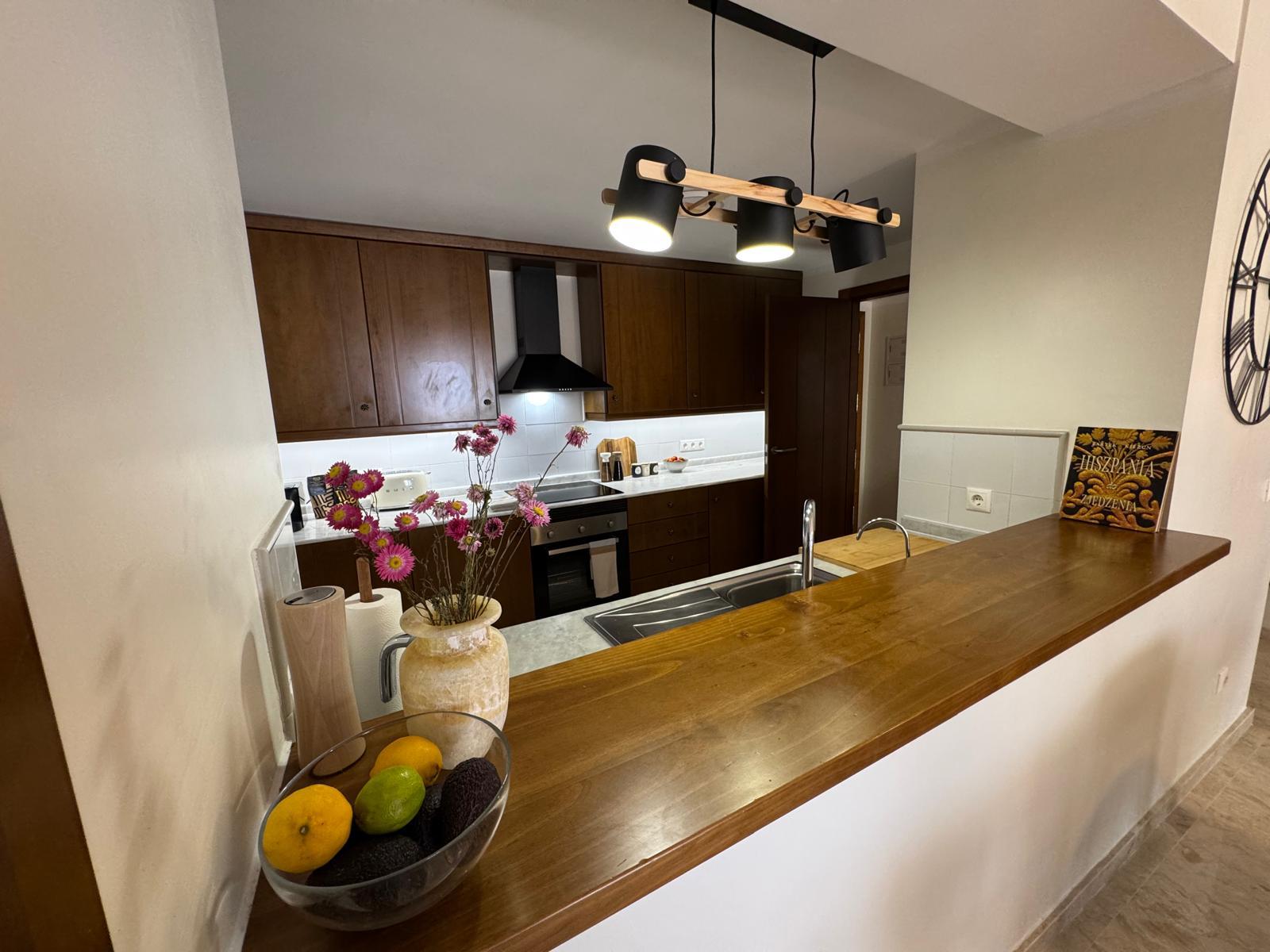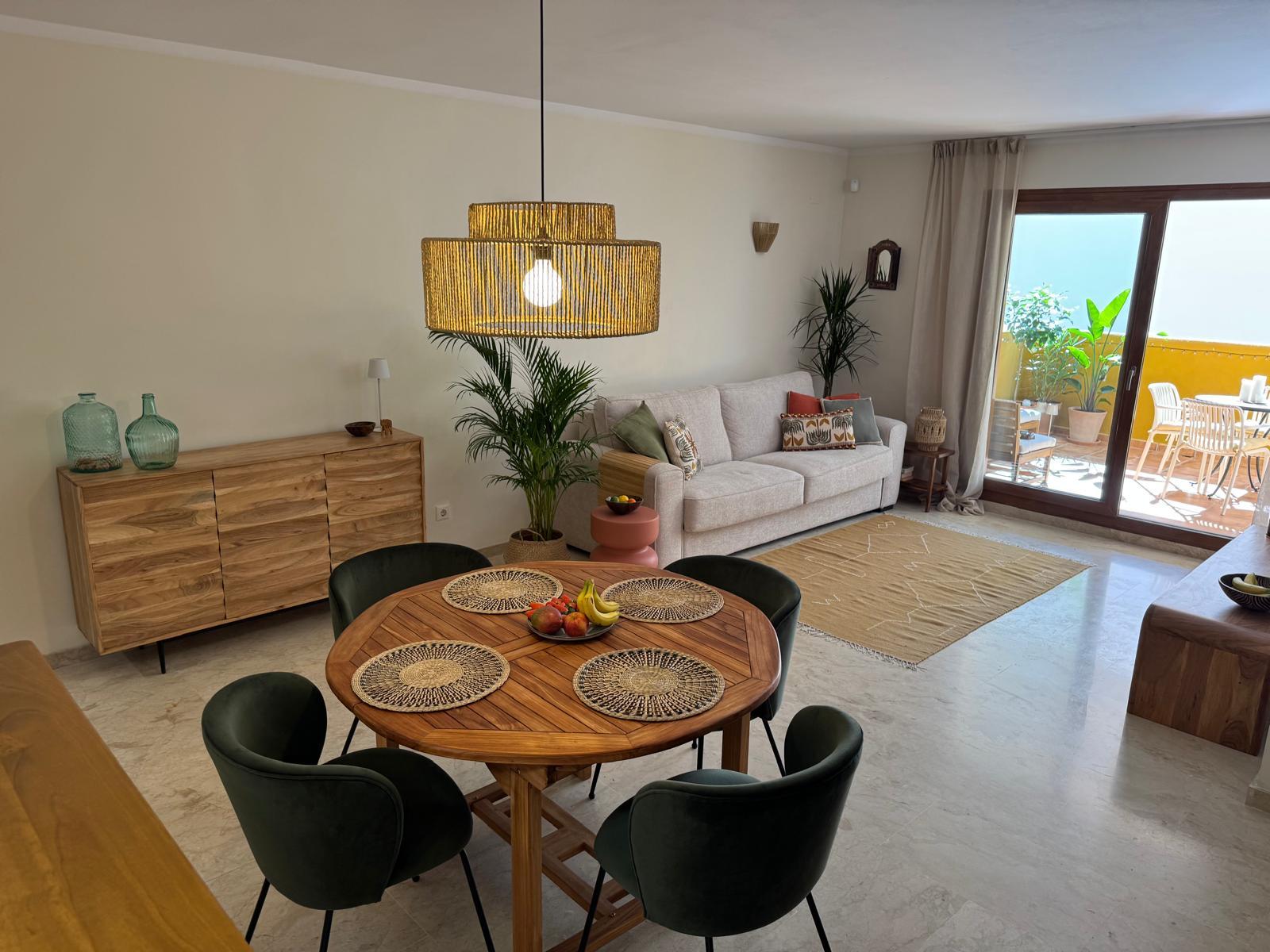 Apartament jest przestronny, jasny i urządzony w eleganckim, śródziemnomorskim stylu. Naturalne kolory, drewno i starannie dobrane dodatki tworzą przyjemną, wakacyjną atmosferę.