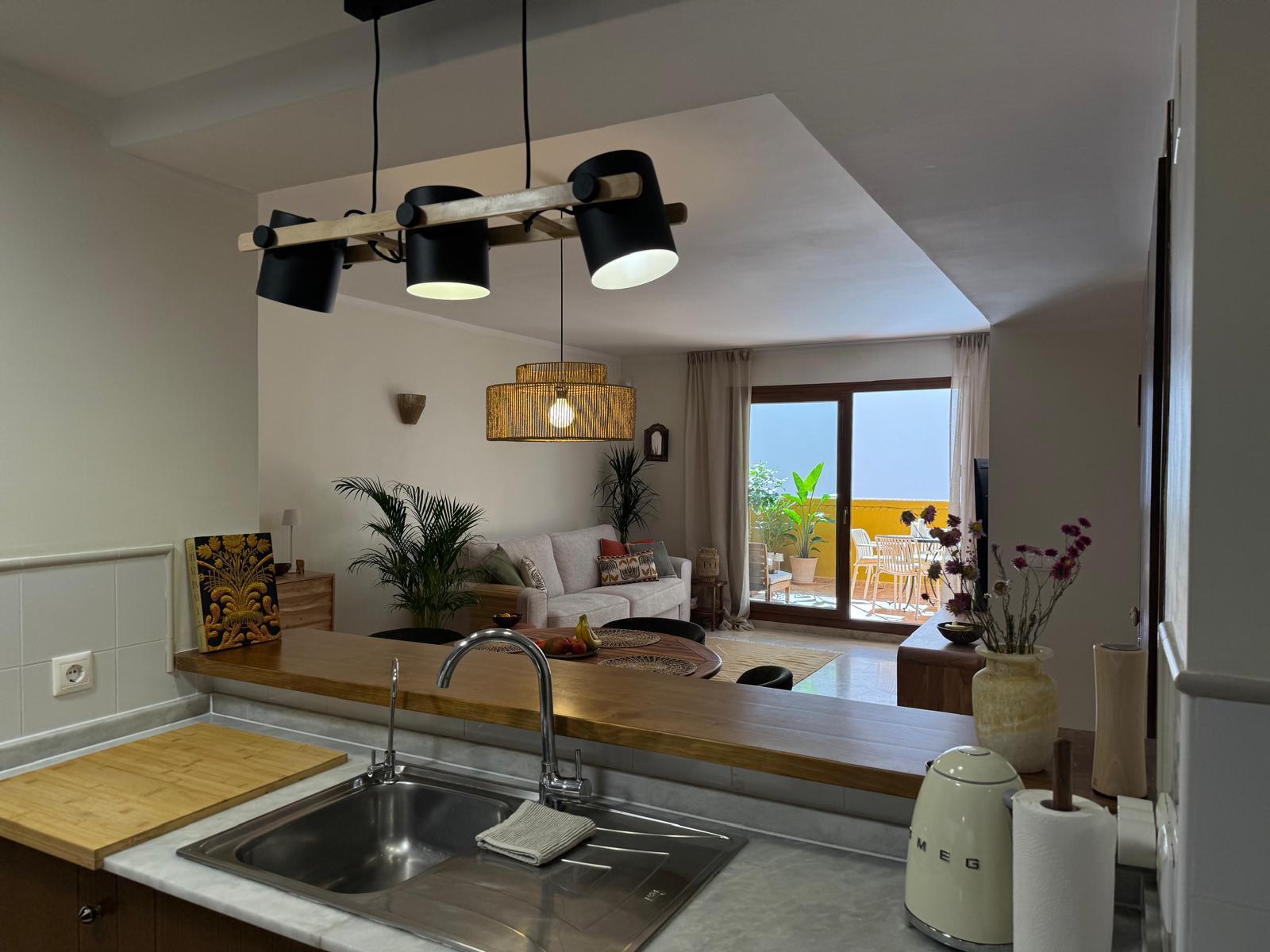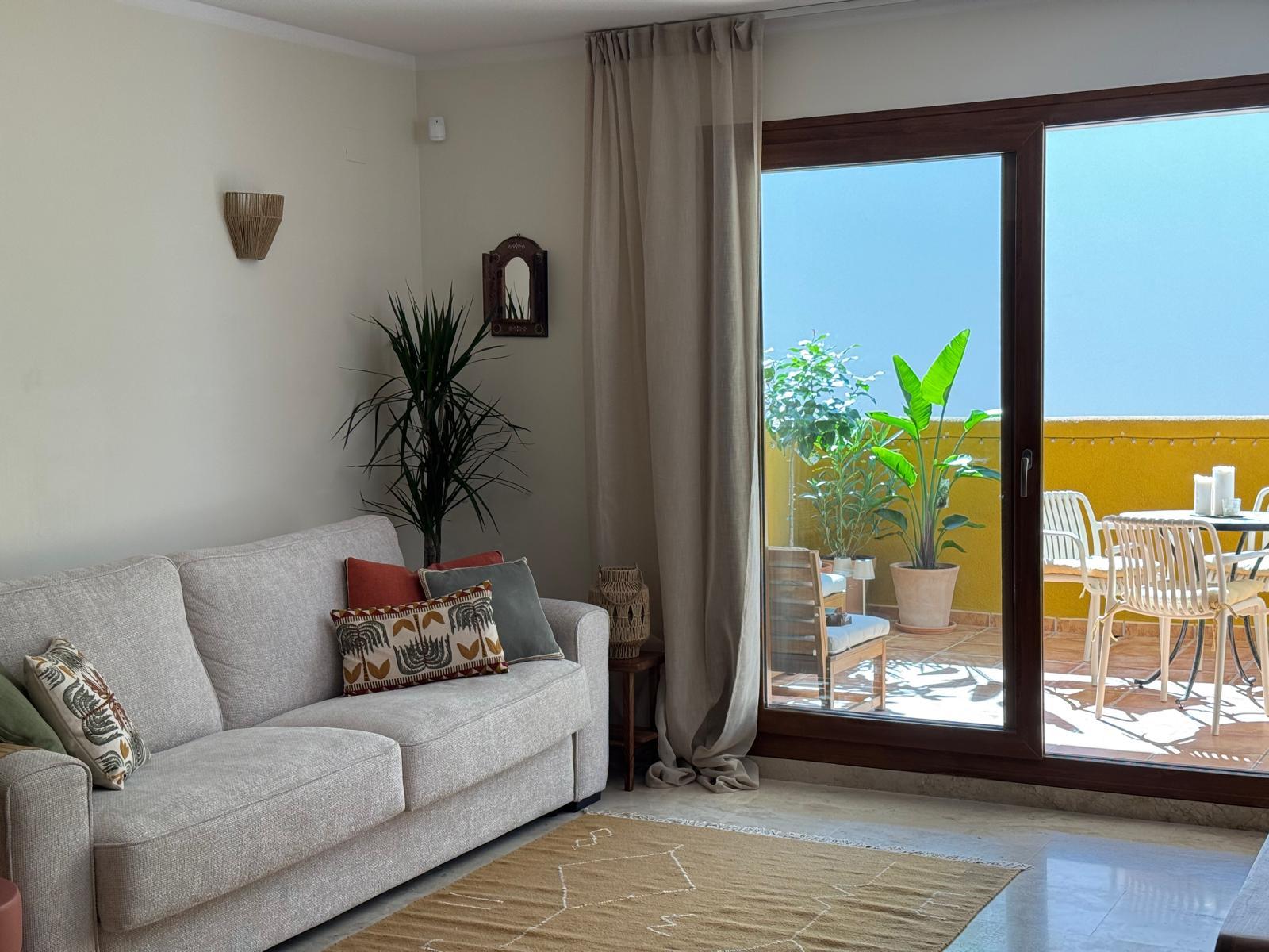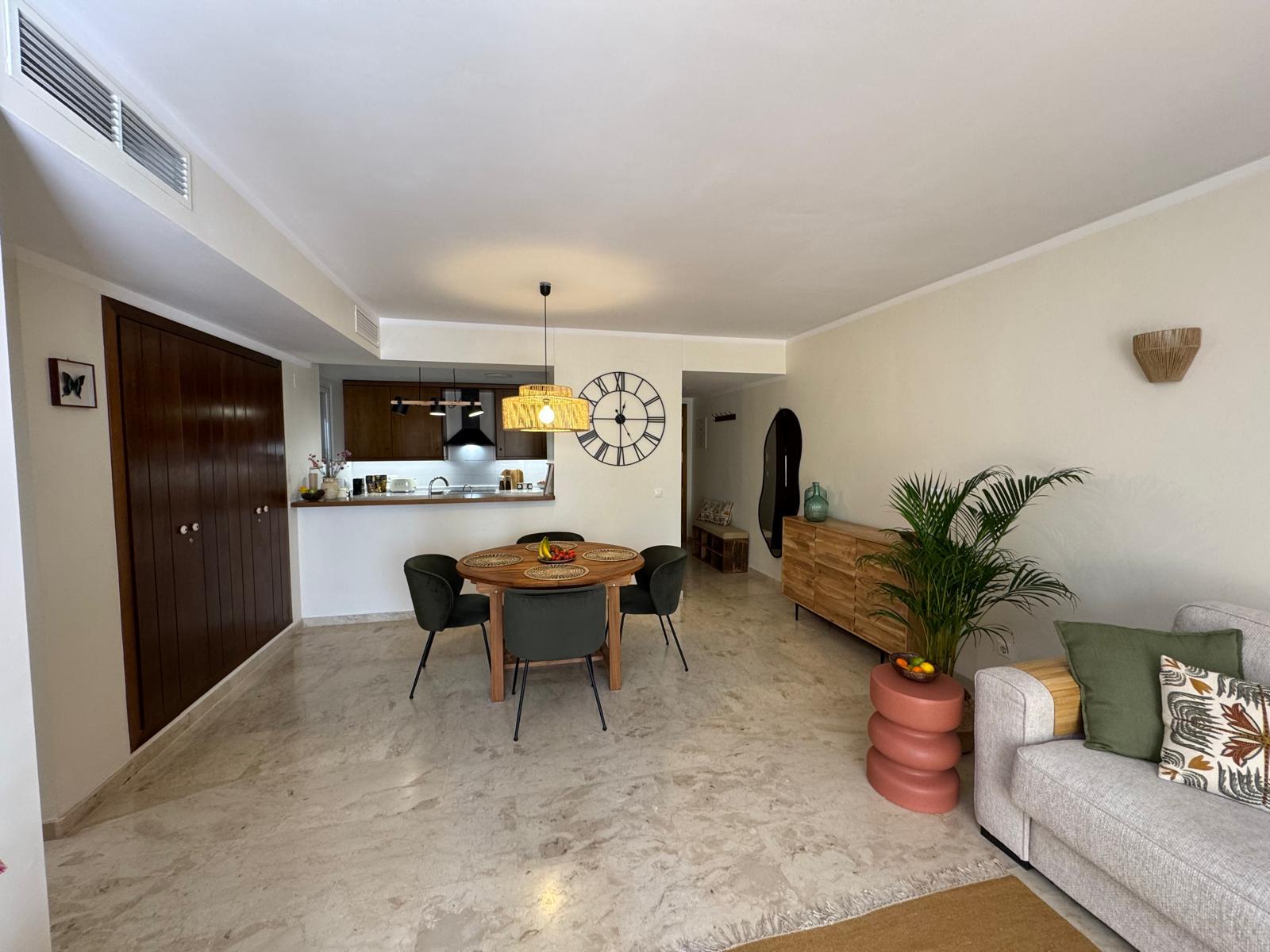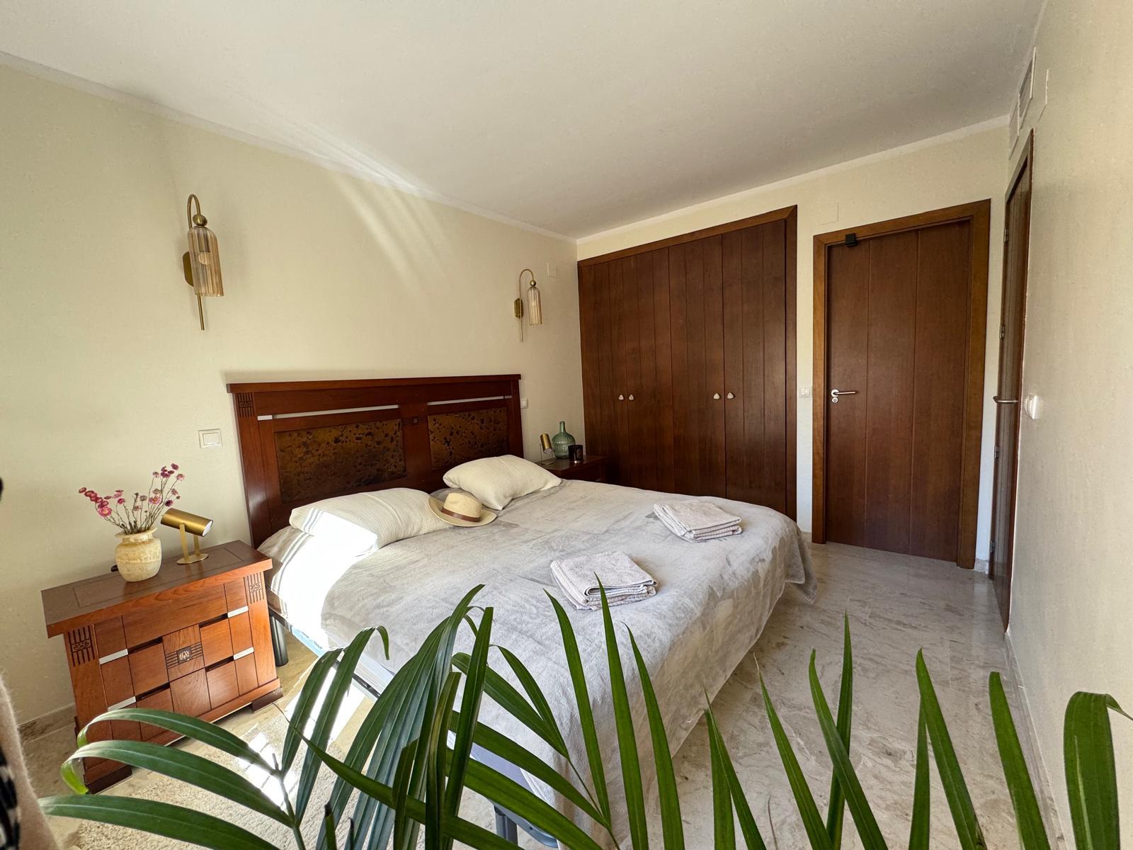 Apartament jest przestronny, jasny i urządzony w eleganckim, śródziemnomorskim stylu. Naturalne kolory, drewno i starannie dobrane dodatki tworzą przyjemną, wakacyjną atmosferę.
