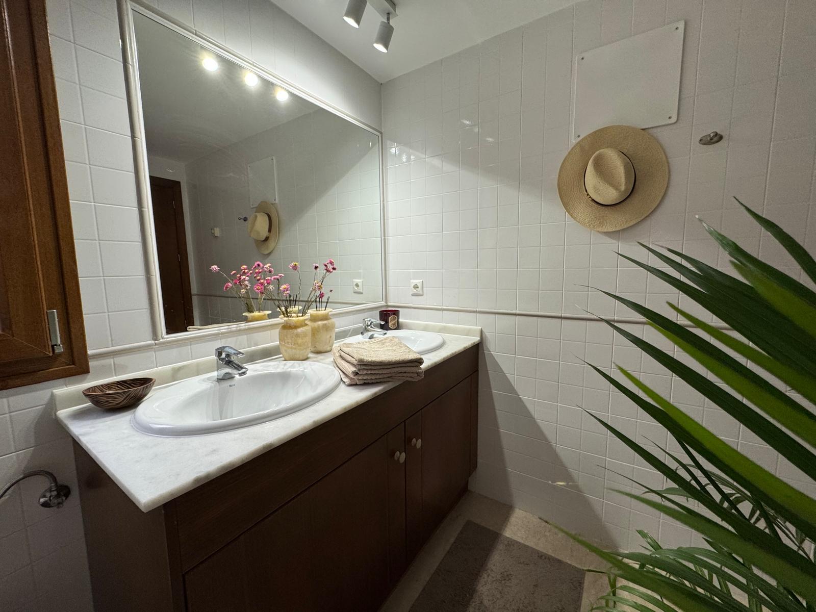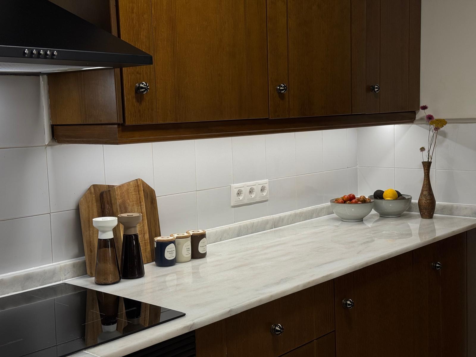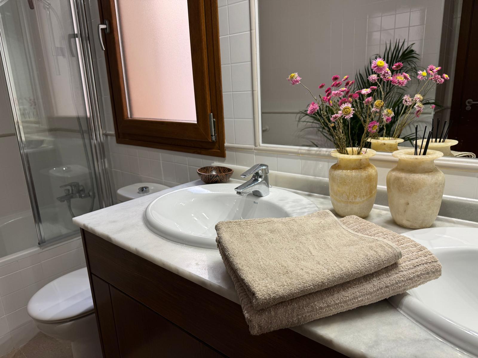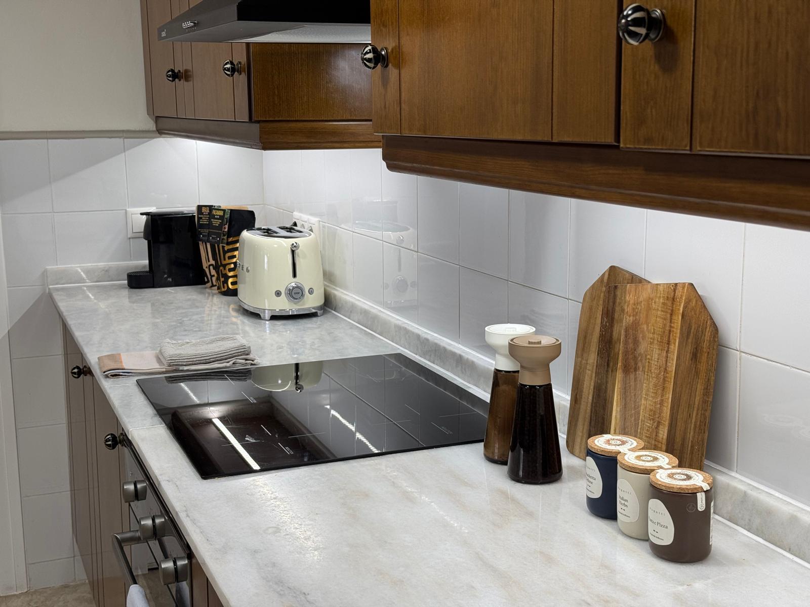 Apartament jest przestronny, jasny i urządzony w eleganckim, śródziemnomorskim stylu. Naturalne kolory, drewno i starannie dobrane dodatki tworzą przyjemną, wakacyjną atmosferę.