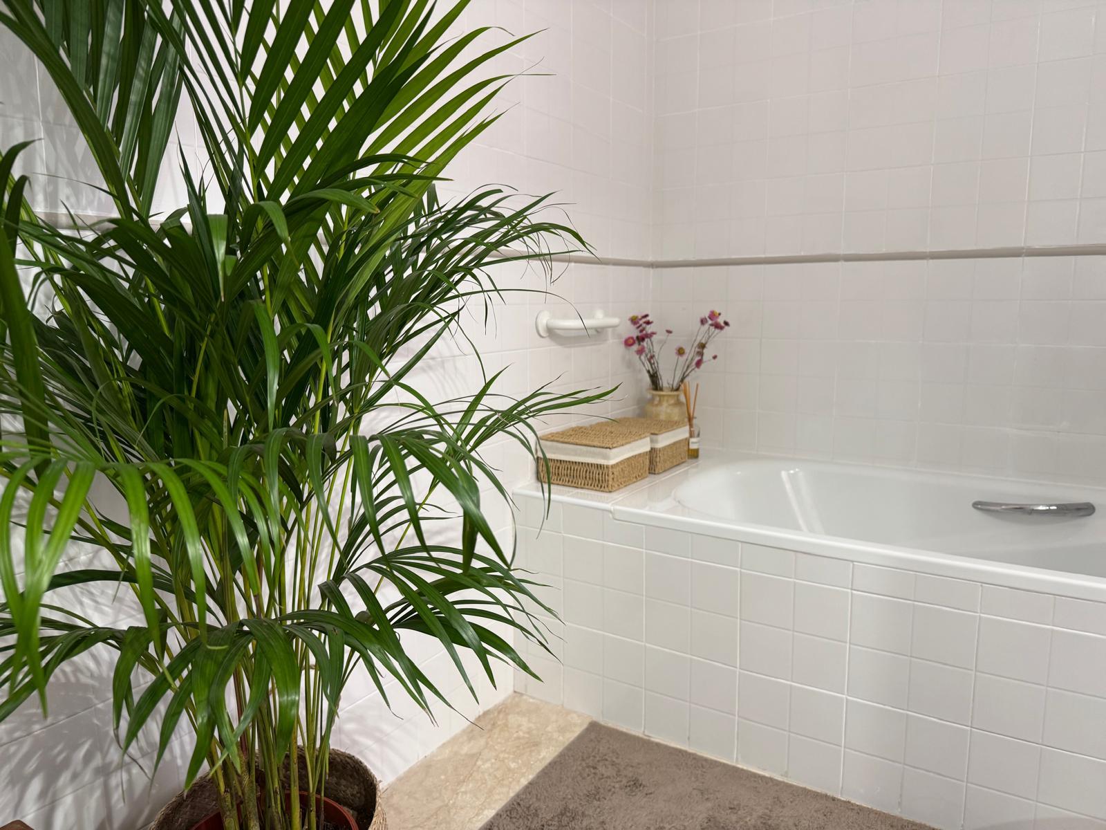 Sypialnia główna (master bedroom) z dużym łóżkiem małżeńskim oraz prywatną łazienką en-suite z wanną, co zapewnia wygodę i prywatność.