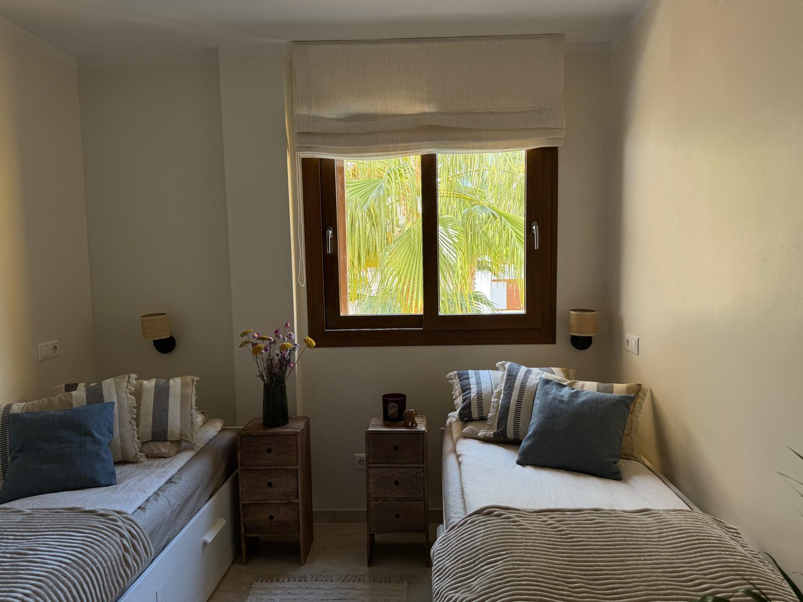 Druga sypialnia wyposażona w dwa pojedyncze łóżka z możliwością dostawienia trzeciego – idealna dla dzieci lub grupy przyjaciół.