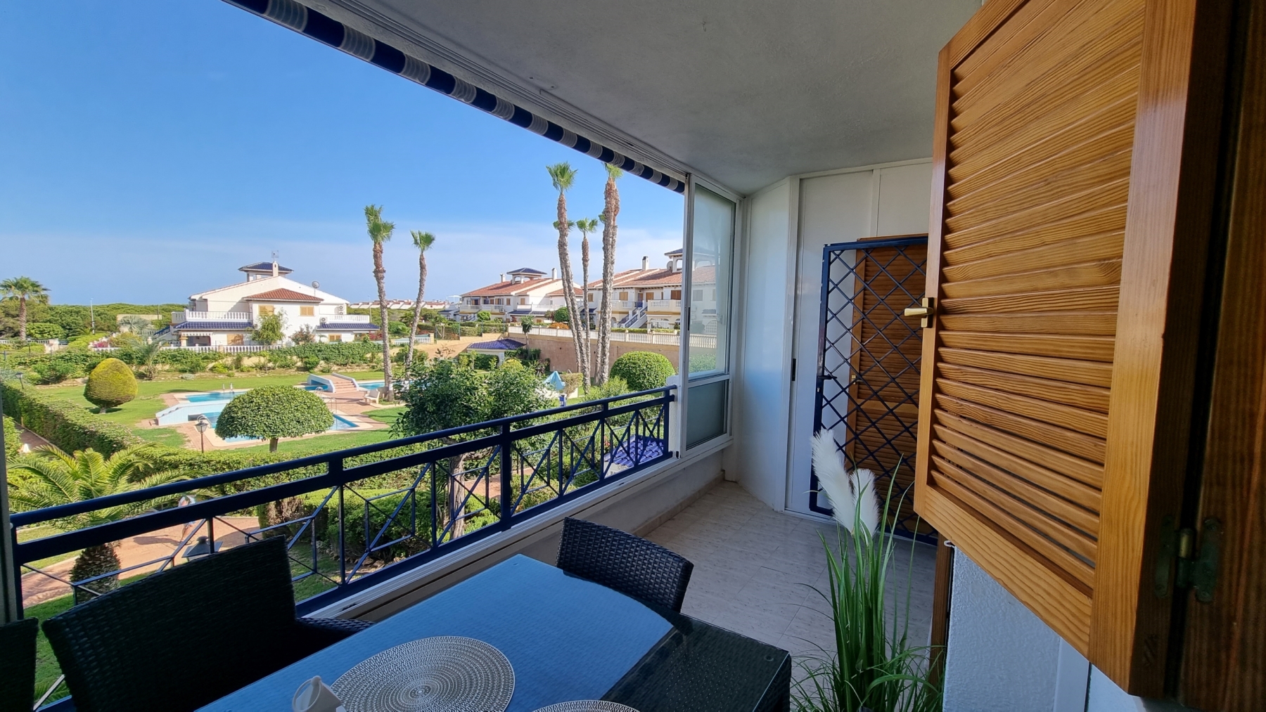 - 🌞 Taras/balkon z widokiem na basen i zadbany ogród – idealny na poranną kawę lub wieczorne wino
