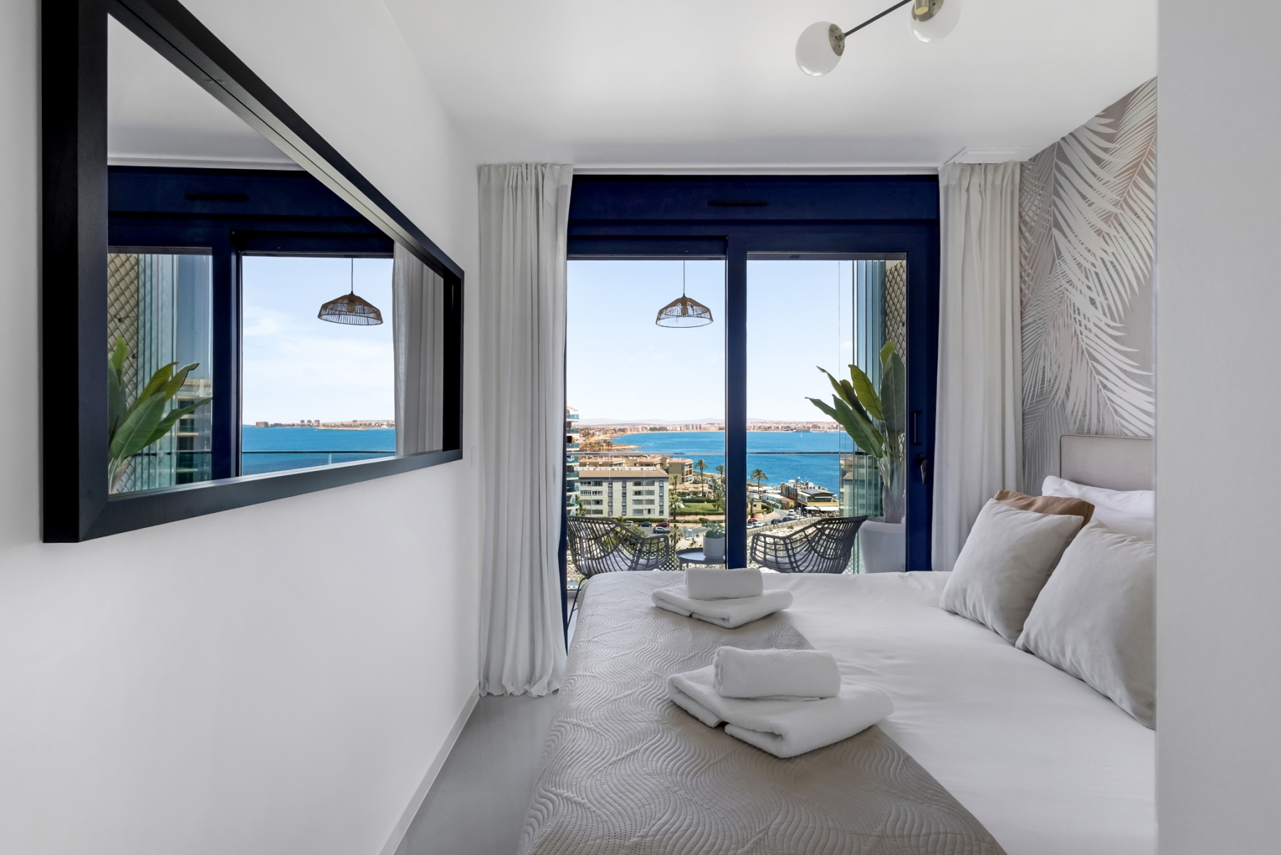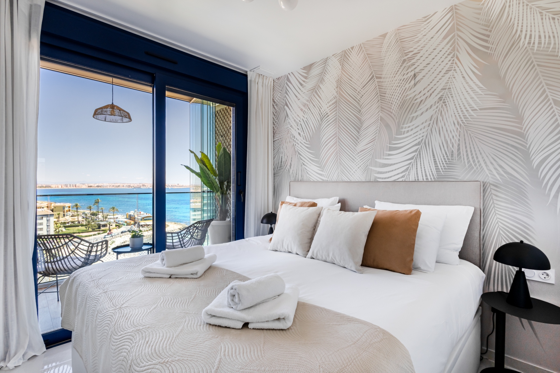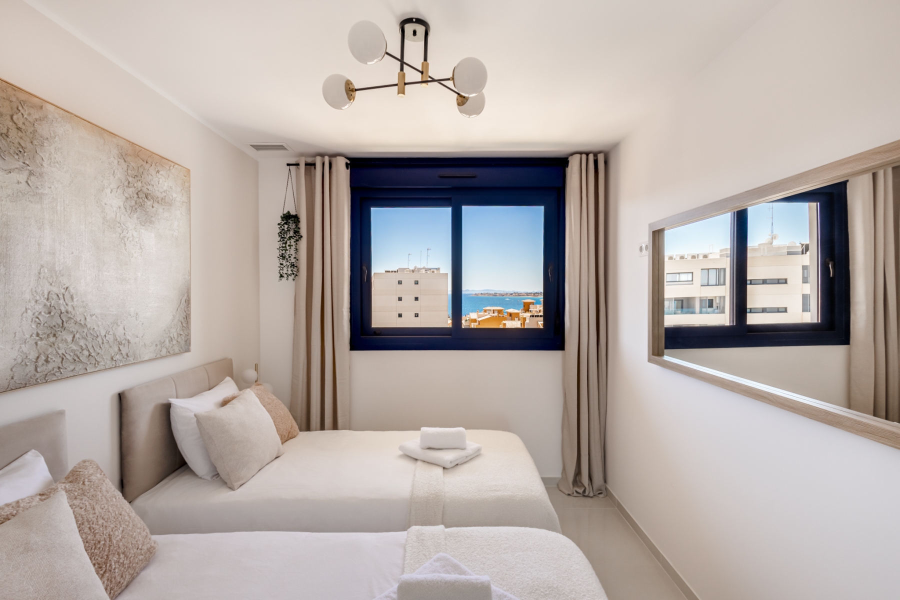 PANORAMA Seaview Deluxe Apartment to luksusowy apartament w pierwszej linii brzegowej w Punta Prima, Torrevieja. Apartament oferuje 2 komfortowe sypialnie i 2 łazienki (w tym jedną prywatną przy głównej sypialni). Przestronny salon z jadalnią prowadzi na duży taras z osłoną przeciwwiatrową, z którego rozciąga się zapierający dech w piersiach widok na morze i panoramę miasta. Do dyspozycji gości jest w pełni wyposażona kuchnia i osobna pralnia.